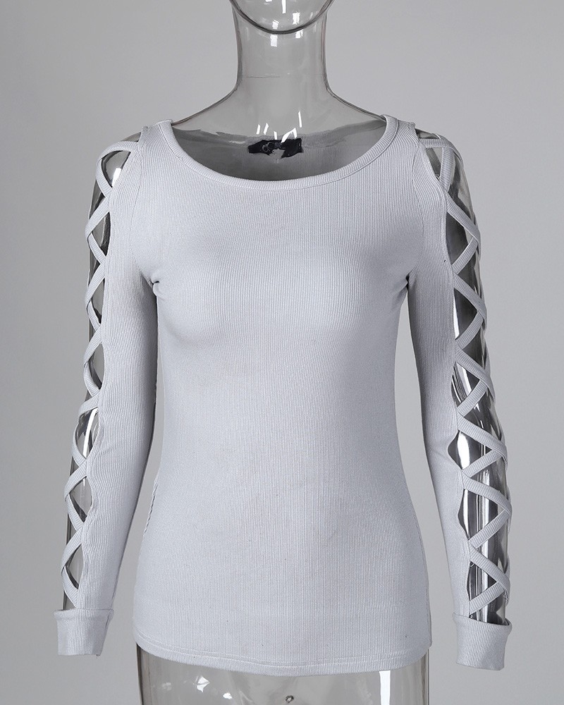 Black Lace Up Design Plain Cold Shoulder Long Sleeves T Shirts